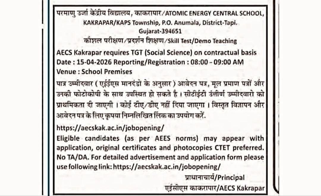AECS Kakrapar Recruitment 2026: Atomic Energy Central School (AECS), કાકરાપાર દ્વારા વર્ષ 2026 માટે Trained Graduate Teacher (TGT) – Social Science પદ માટે નવી ભરતી જાહેર કરવામાં આવી છે. આ ભરતી ખાસ કરીને એવા ઉમેદવારો માટે છે જે શિક્ષણ ક્ષેત્રમાં પોતાની કારકિર્દી મજબૂત બનાવવી ઇચ્છે છે અને એક પ્રતિષ્ઠિત શૈક્ષણિક સંસ્થા સાથે જોડાવા માંગે છે. AECS કાકરાપાર, જે KAPS Township, તાપી જિલ્લામાં આવેલ છે, તે Atomic Energy Education Society હેઠળ કાર્યરત એક શ્રેષ્ઠ શાળા છે, જ્યાં ગુણવત્તાસભર શિક્ષણ અને શિસ્તબદ્ધ વાતાવરણ ઉપલબ્ધ છે.