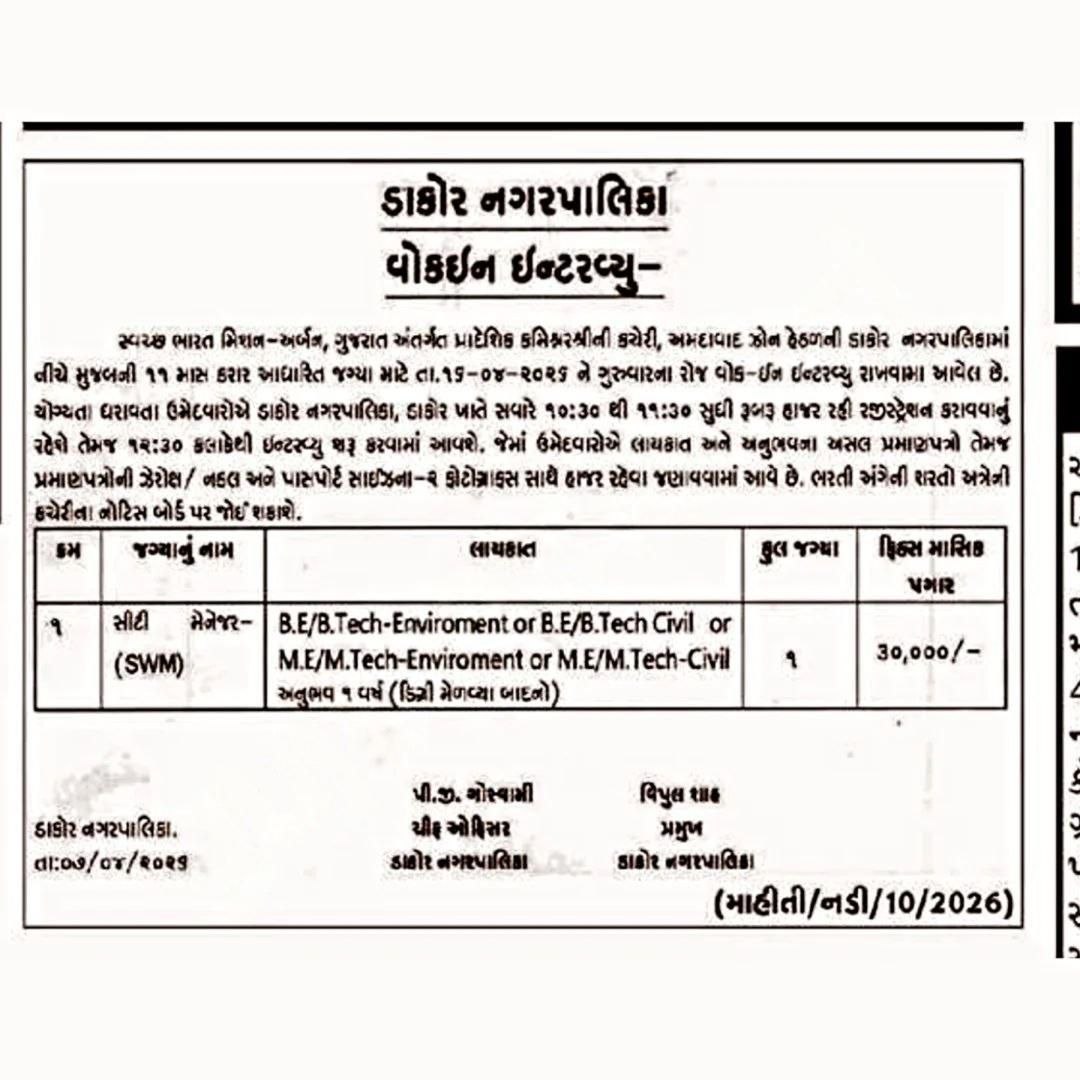 Dakor નગરપાલિકા ભરતી 2026 એ એવા ઉમેદવારો માટે એક ઉત્તમ તક છે જે પર્યાવરણ અને શહેરી વિકાસ ક્ષેત્રમાં કામ કરવા માંગે છે. City Manager (SWM) પદ દ્વારા ઉમેદવારોને જાહેર સેવા સાથે જોડાઈને શહેરની સ્વચ્છતા અને વિકાસમાં યોગદાન આપવાનો અવસર મળે છે. જો તમે લાયકાત ધરાવો છો, તો આ તક ચૂકી ન જશો. સમયસર ઇન્ટરવ્યૂ માટે હાજર રહો અને તમારી તૈયારી પૂર્ણ રાખો.