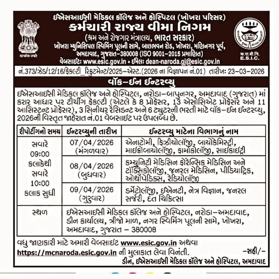 ESIC Medical College Ahmedabad Recruitment 2026: Employees’ State Insurance Corporation (ESIC) મેડિકલ કોલેજ અને હોસ્પિટલ, અમદાવાદ દ્વારા વર્ષ 2026 માટે વિવિધ શૈક્ષણિક અને તબીબી પદો માટે મોટી ભરતી જાહેર કરવામાં આવી છે. આ ભરતી ખાસ કરીને તબીબી ક્ષેત્રમાં કાર્યરત પ્રોફેશનલ્સ માટે છે, જેમણે પોતાના ક્ષેત્રમાં અનુભવ મેળવ્યો છે અને સરકારી મેડિકલ સંસ્થામાં સેવા આપવાની ઈચ્છા ધરાવે છે.