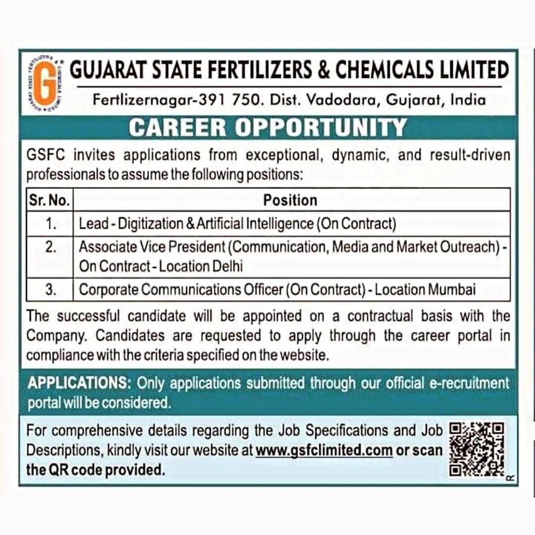 GSFC Recruitment 2026: ગુજરાત સ્ટેટ ફર્ટિલાઇઝર્સ એન્ડ કેમિકલ્સ લિમિટેડ (GSFC) દ્વારા વર્ષ 2026 માટે નવી ભરતી જાહેર કરવામાં આવી છે. આ ભરતી ખાસ કરીને એવા ઉમેદવારો માટે છે જે ટેક્નોલોજી, આર્ટિફિશિયલ ઇન્ટેલિજન્સ (AI), ડિજિટલ ટ્રાન્સફોર્મેશન અને કોર્પોરેટ કોમ્યુનિકેશન ક્ષેત્રમાં કારકિર્દી બનાવવા માંગે છે. GSFC ભારતની અગ્રણી કેમિકલ અને ફર્ટિલાઇઝર કંપનીઓમાંની એક છે અને અહીં કામ કરવાનો અવસર ઉમેદવારોને એક પ્રતિષ્ઠિત અને વ્યાવસાયિક વાતાવરણ આપે છે.