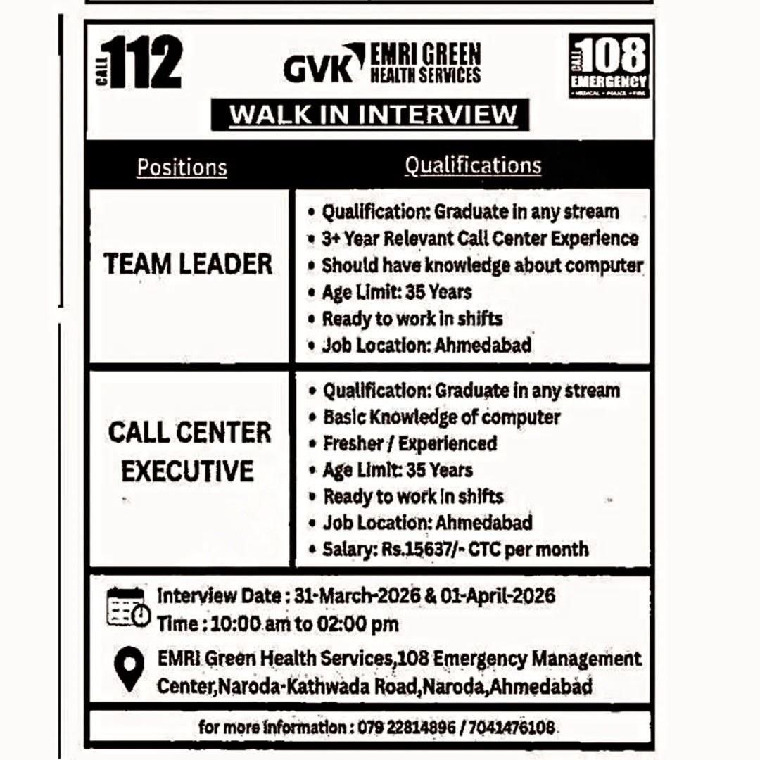 આ એક ઉત્તમ તક છે ખાસ કરીને એવા ઉમેદવારો માટે જેમને કોલ સેન્ટર ક્ષેત્રમાં અનુભવ છે અથવા ફ્રેશર તરીકે કારકિર્દી શરૂ કરવી છે. GVK EMRI સાથે જોડાવું એટલે માત્ર નોકરી નહીં, પરંતુ જીવન બચાવતી સેવાઓનો ભાગ બનવું.
