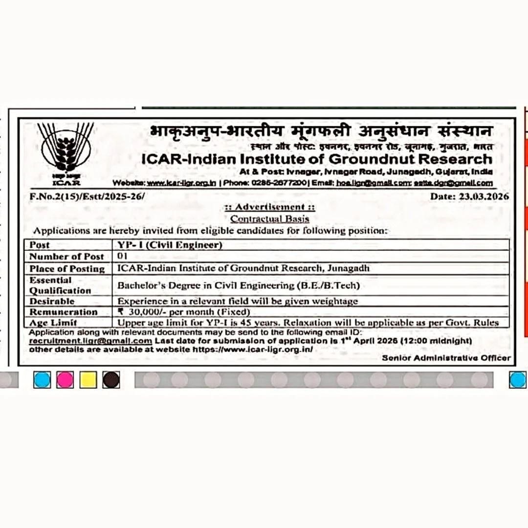 ICAR-IIGR Recruitment 2026: ભારતીય કૃષિ સંશોધન પરિષદ હેઠળ કાર્યરત ICAR-Indian Institute of Groundnut Research (IIGR), જુનાગઢ દ્વારા વર્ષ 2026 માટે Young Professional-I (Civil Engineer) પદ માટે ભરતી જાહેર કરવામાં આવી છે. આ ભરતી ખાસ કરીને એવા સિવિલ એન્જિનિયરિંગ ગ્રેજ્યુએટ ઉમેદવારો માટે છે, જેઓ સરકારી સંશોધન સંસ્થામાં કામ કરવાનો અનુભવ મેળવવા માંગે છે. જુનાગઢ સ્થિત આ સંસ્થા દેશના અગ્રણી કૃષિ સંશોધન કેન્દ્રોમાંની એક છે, જ્યાં કામ કરવું એક પ્રતિષ્ઠિત તક માનવામાં આવે છે.