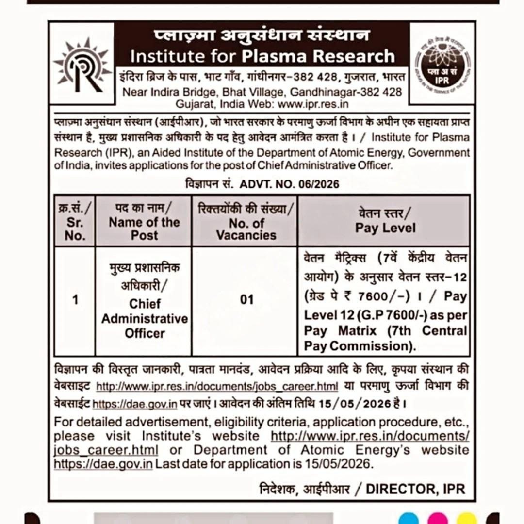 IPR Chief Administrative Officer Recruitment 2026: ગાંધીનગર સ્થિત Institute for Plasma Research (IPR) દ્વારા વર્ષ 2026 માટે Chief Administrative Officer પદ માટે એક મહત્વપૂર્ણ ભરતી જાહેર કરવામાં આવી છે. આ સંસ્થા ભારત સરકારના Department of Atomic Energy હેઠળ કાર્યરત એક અતિ પ્રતિષ્ઠિત સંશોધન સંસ્થા છે, જે પ્લાઝ્મા અને ફ્યુઝન એનર્જી ક્ષેત્રમાં આગવી ઓળખ ધરાવે છે. આ ભરતી ખાસ કરીને એવા અનુભવી અને લાયકાત ધરાવતા ઉમેદવારો માટે છે, જે પ્રશાસનિક ક્ષેત્રમાં ઉચ્ચ પદ પર કાર્ય કરવાની ઇચ્છા ધરાવે છે.