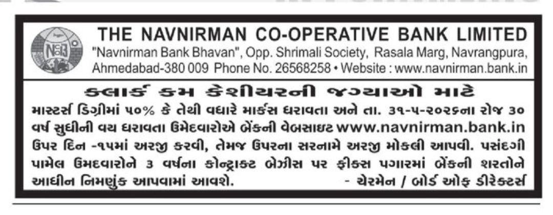 Navnirman Co-operative Bank Recruitment 2026: અમદાવાદમાં સ્થિત પ્રખ્યાત સહકારી બેંક Navnirman Co-operative Bank Limited દ્વારા વર્ષ 2026 માટે Clerk cum Cashier પદ માટે ભરતી જાહેર કરવામાં આવી છે. બેંકિંગ ક્ષેત્રમાં કારકિર્દી બનાવવા માંગતા અને પોસ્ટગ્રેજ્યુએટ લાયકાત ધરાવતા ઉમેદવારો માટે આ એક સારો અવસર માનવામાં આવે છે. ખાસ કરીને ગુજરાતના ઉમેદવારો માટે આ ભરતી મહત્વપૂર્ણ છે, કારણ કે નોકરીનું સ્થાન અમદાવાદમાં રહેશે અને બેંકનો કામકાજ સ્થાનિક સ્તરે મજબૂત રીતે જોડાયેલો છે.